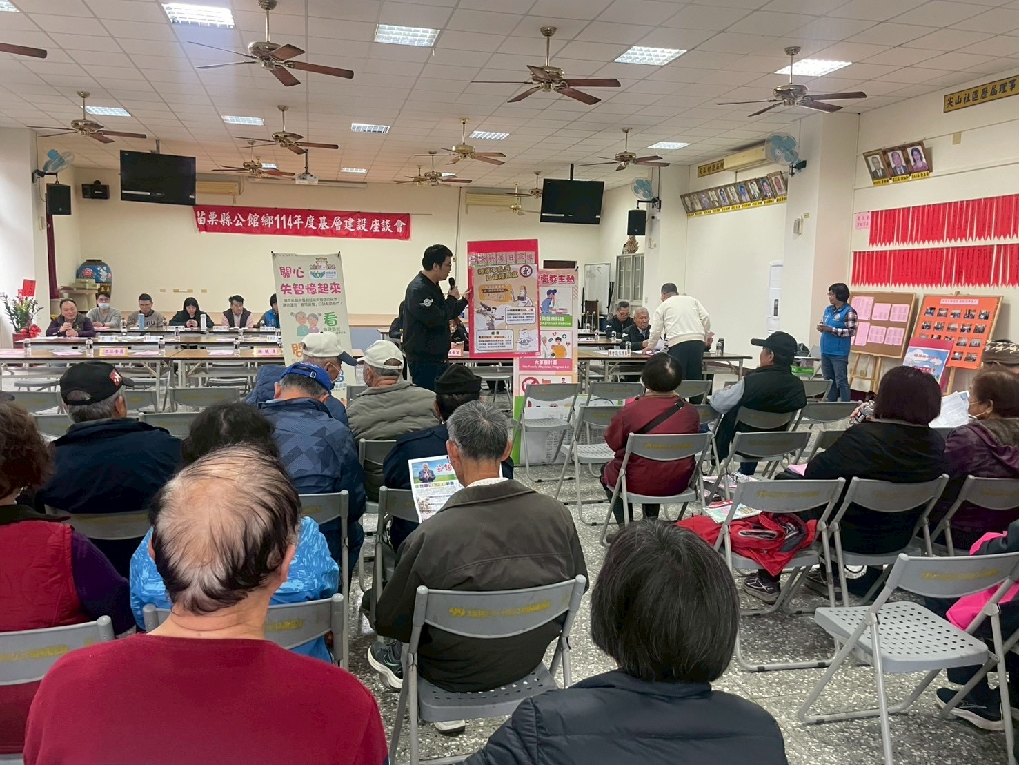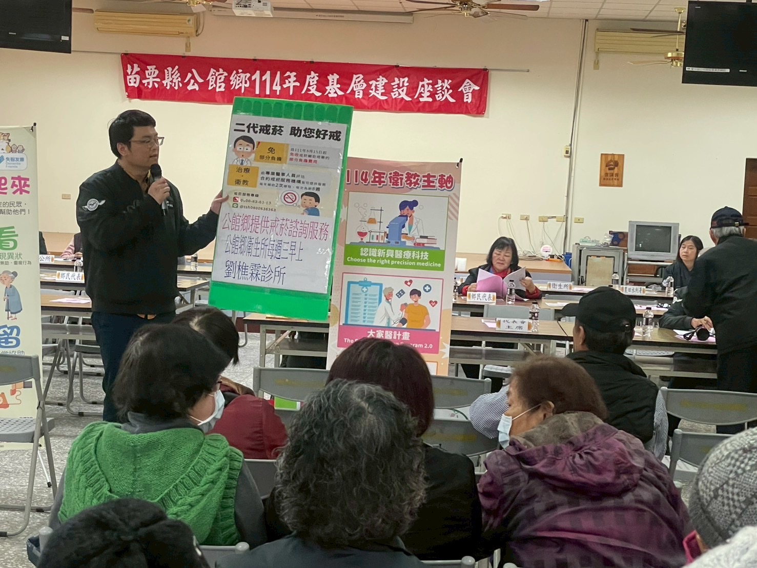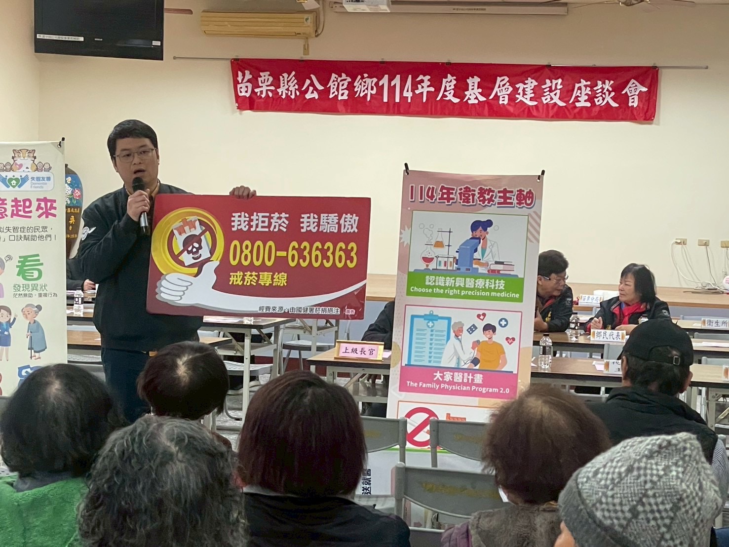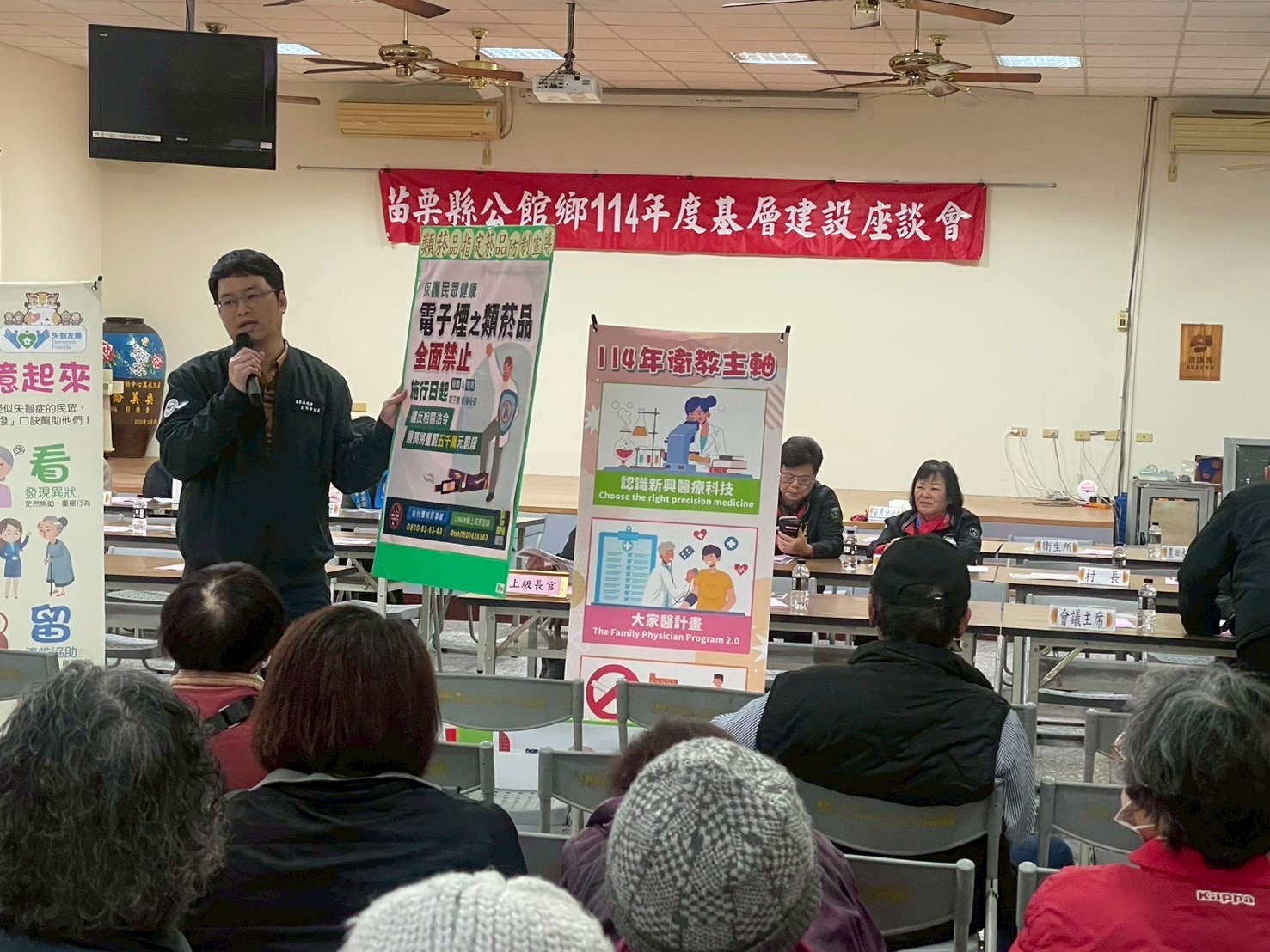 「社區菸害防制宣導-村、鄰長基層座談會」公館鄉衛生所訂於114年03月31日(星期一)上午9:00~9:30於【公館尖山社區活動中心】搭配『公館鄉公所基層座談會-第二區』活動辦理『菸品的危害』『倡導無菸環境: 二手菸、三手菸的危害』『電子煙的危害、任何人不得使用、販售及展示電子煙』及『菸害防制法』,『醫療單位提供戒菸藥物治療及衛教諮詢服務』,敬請長官蒞臨指導。