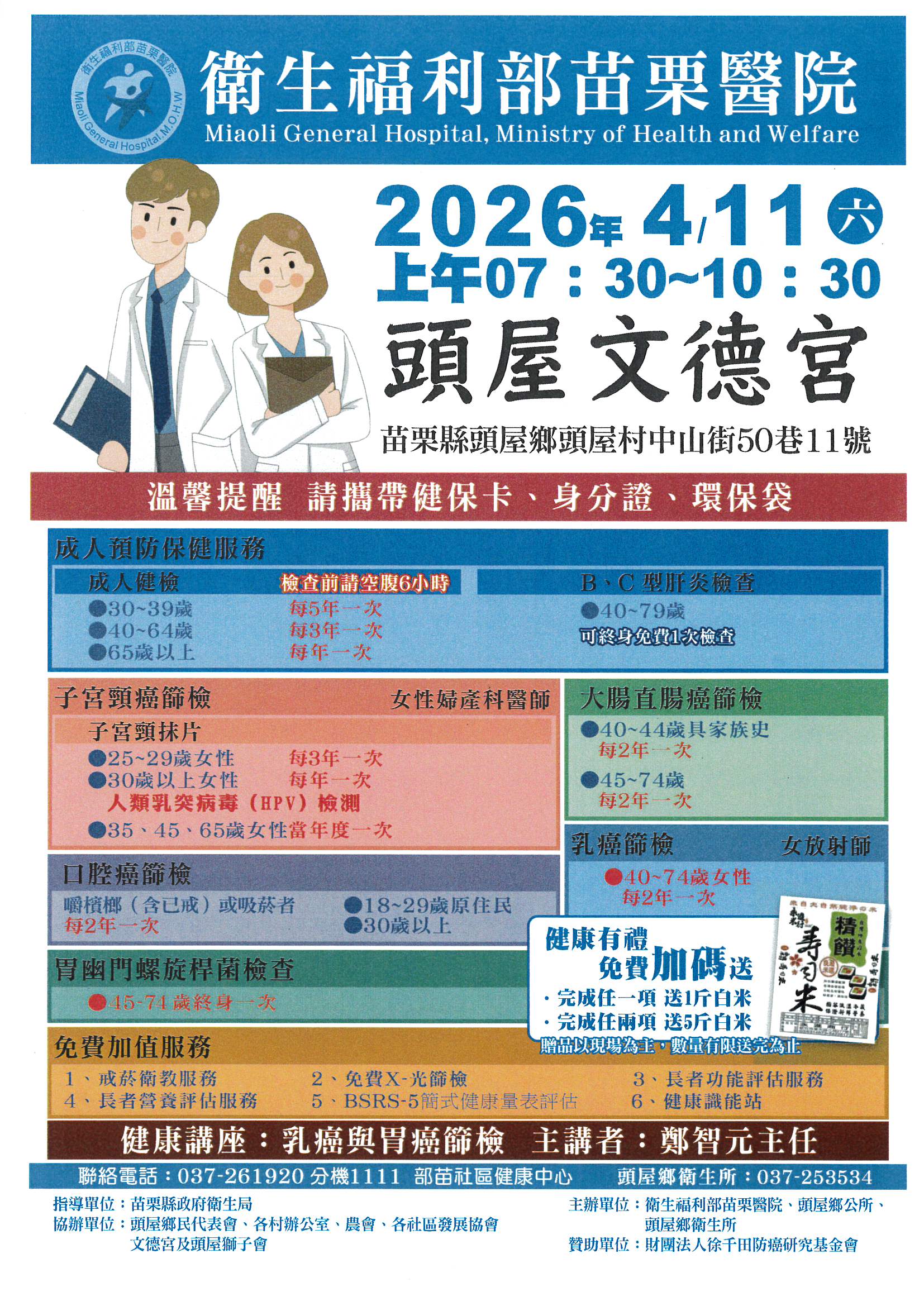 為提升縣民健康照護品質,提供更便利、可近性的預防保健篩檢服務,苗栗縣政府衛生局攜手頭屋鄉衛生所、頭屋鄉公所及部立苗栗醫院醫療團隊,將於 115年4月11日(星期六)上午7時30分至10時30分,在頭屋鄉文德宮舉辦「做檢查、顧健康」整合性健康篩檢活動。邀請頭屋鄉親把握機會,在熟悉的社區環境中一次完成多項重要檢查,為自己的健康把關。