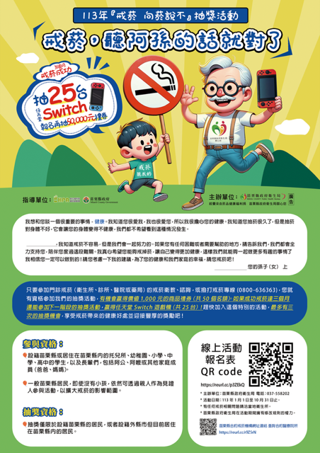 鍾東錦縣長表示為維護民眾健康,提升癮君子們戒菸的動機及成功戒菸,今年活動為鼓勵吸菸者持續戒菸,抽獎活動自1月1日起至10月30日止,凡參與門診戒菸、戒菸衛教或撥打戒菸專線者(0800-636363免付費電話 ),即可參加1次抽獎。苗栗縣政府衛生局共設了75個獎項,獎項十分豐富及吸引人,參加獎每1名可獲得100元商品禮券10張,共50名。3個月戒菸成功獎,共25名,可獲得任天堂Switch遊戲機。參加抽獎方式非常簡單,只要攜帶健保卡,前往本縣54家門診戒菸合約醫療院所掛號就診,就可以線上報名參加抽獎活動。