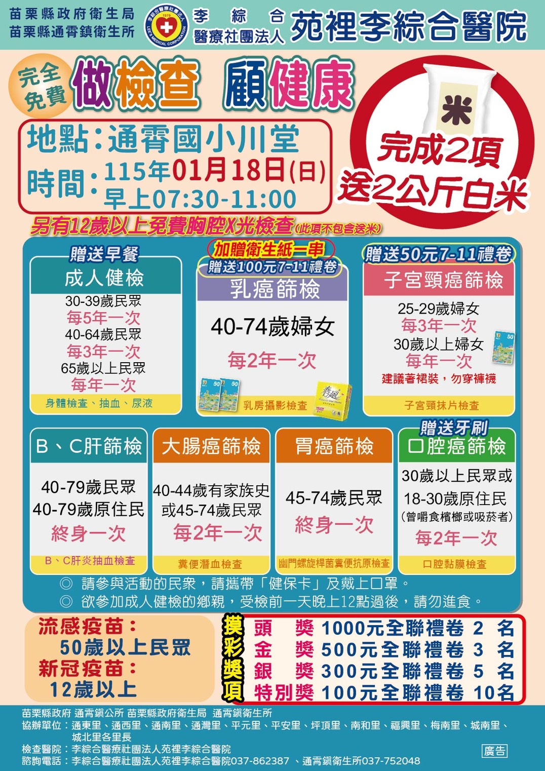 為讓健康檢查更貼近社區、走進民眾生活,苗栗縣政府衛生局攜手通霄鎮衛生所、通霄鎮公所及各里辦公室、社區發展協會、通霄婦女會、婦女新知協會等,結合苑裡李綜合醫院於115年1月18日(星期日)上午7時30分至11時,在通霄國小川堂舉辦「做檢查 顧健康」整合性健康篩檢活動,邀請通霄鎮鄉親把握機會,一次完成多項重要檢查。