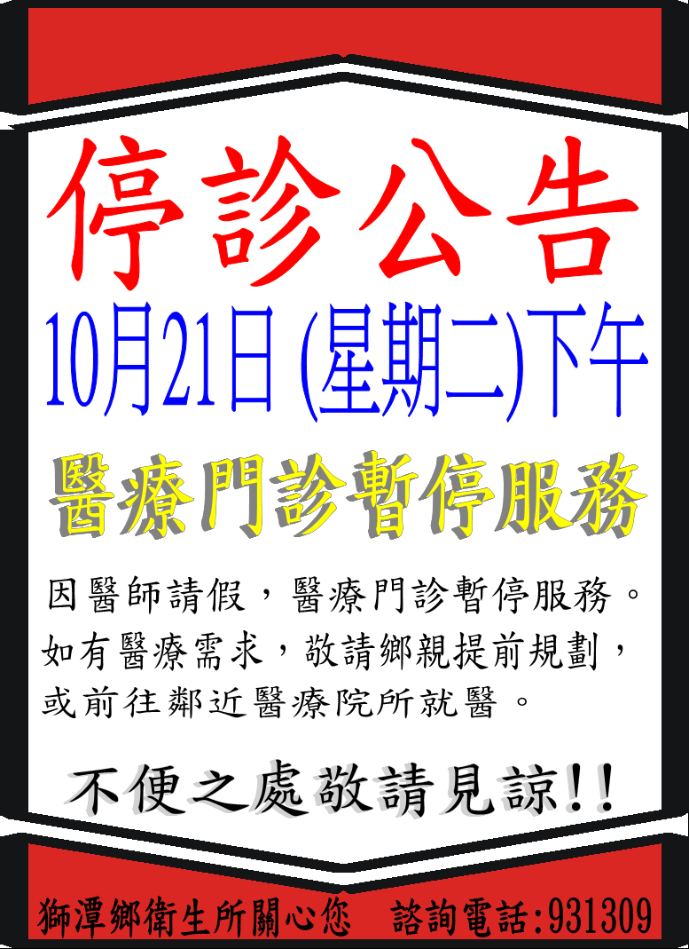 【獅潭鄉衛生所停診公告】 114.10.21(星期二)下午因醫師請假,故暫停醫療門診服務!