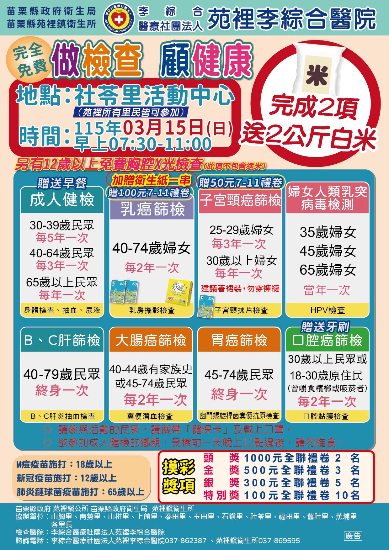 為提升縣民健康照護品質,提供更便利、可近性的預防保健篩檢服務,苗栗縣政府衛生局結合苑裡鎮衛生所、苑裡鎮公所及苑裡李綜合醫院,將於115年03月15日(星期日)上午7時30分至11時00分,假社苓里活動中心辦理「做檢查 顧健康」健康篩檢活動,整合多項免費健康檢查服務,讓民眾在熟悉的社區環境中即可一次完成多項檢查,降低就醫門檻,提升參與意願。