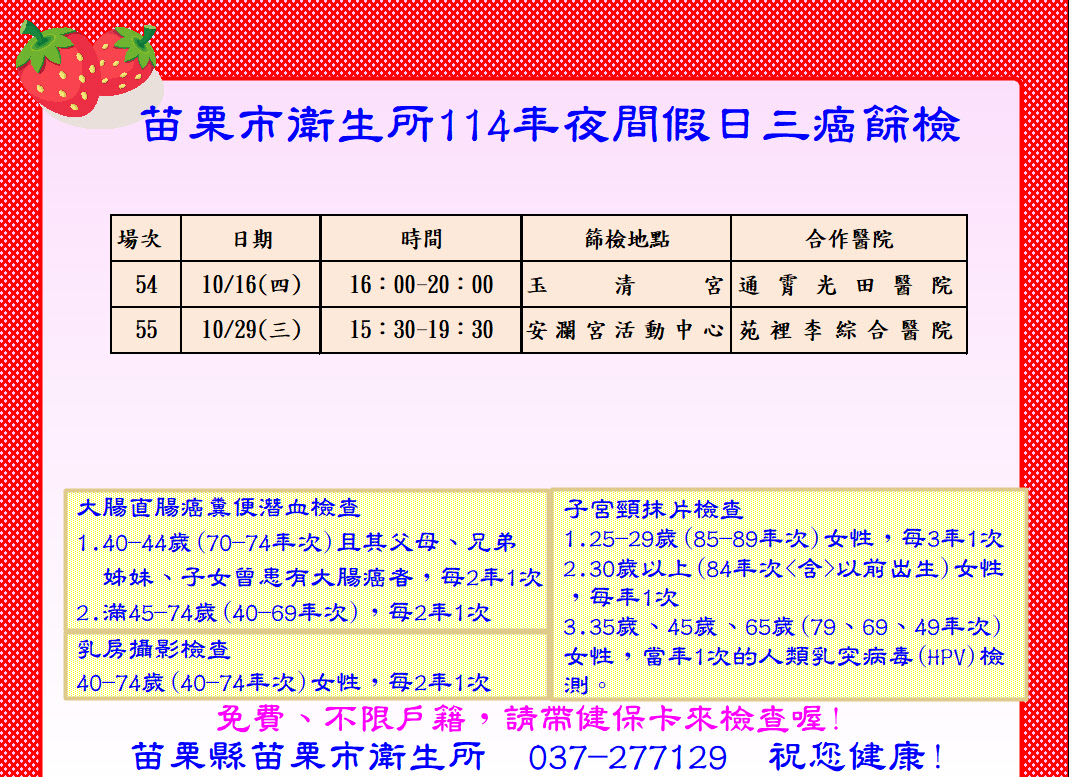苗栗市衛生所癌篩訊息:本所114年10月份免費夜間假日癌症篩檢,請符合資格的鄉親,把握機會,攜帶健保卡前來檢查!