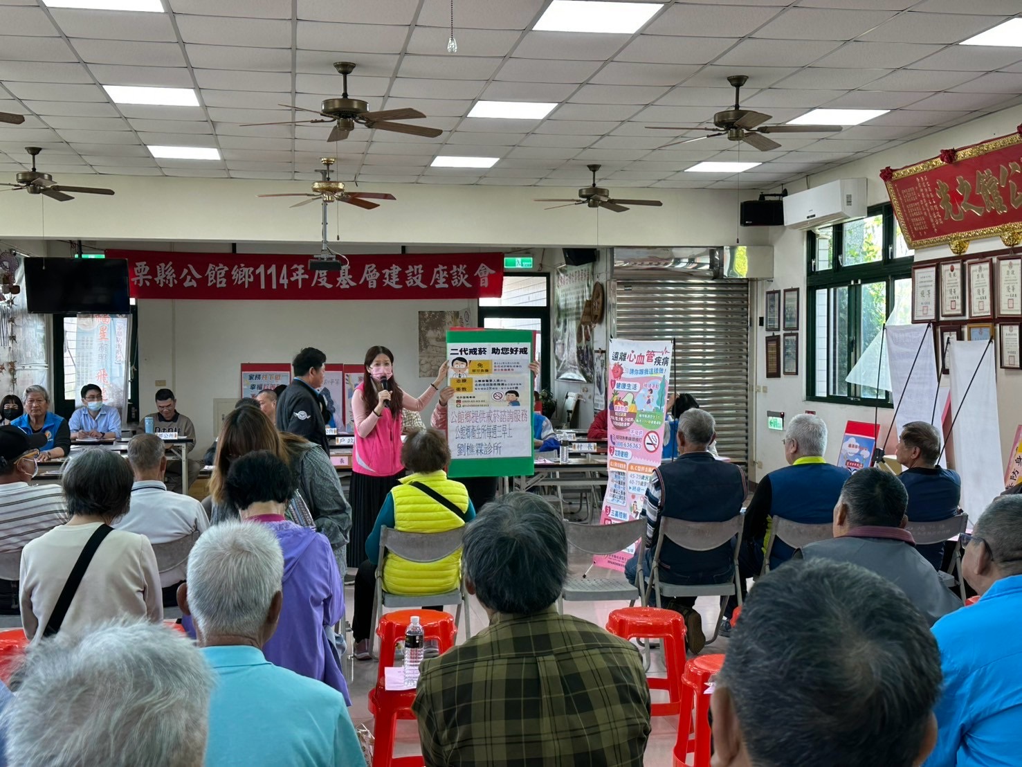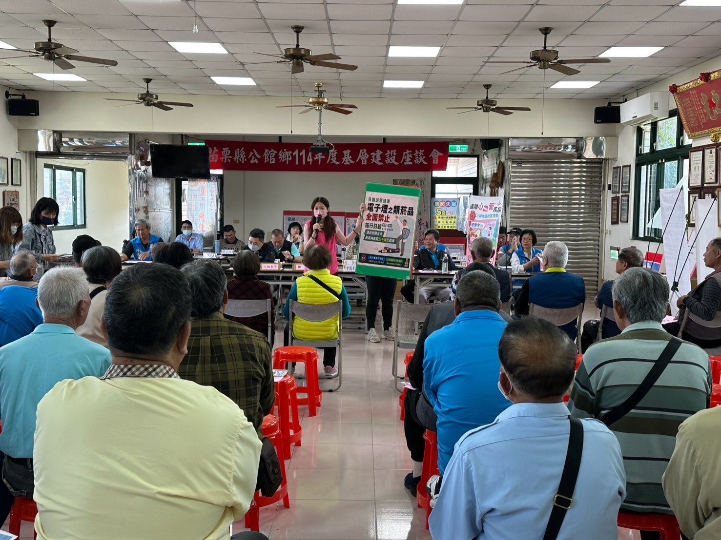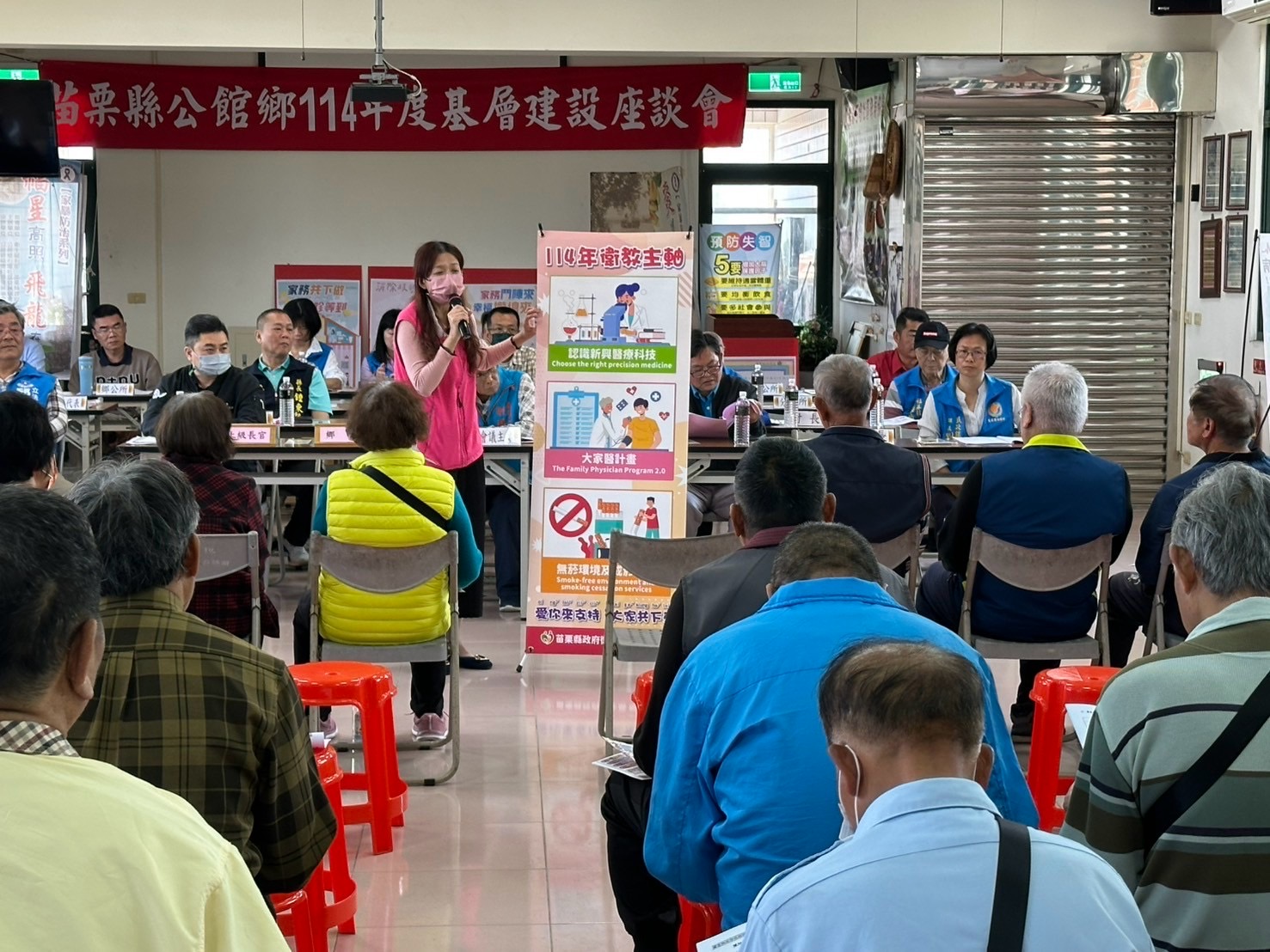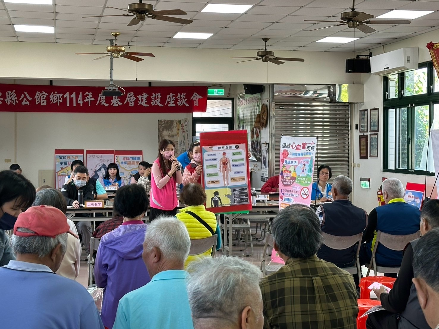 「社區菸害防制宣導-村、鄰長基層座談會」公館鄉衛生所訂於114年03月25日(星期二)上午9:00~9:30於公館石墻活動中心搭配『公館鄉公所基層座談會-第一區』活動辦理『菸品的危害』『倡導無菸環境: 二手菸、三手菸的危害』『電子煙的危害、任何人不得使用、販售及展示電子煙』『菸害防制法』及『戒菸專線宣導』『醫療單位提供戒菸治療及衛教諮詢服務』,敬請長官蒞臨指導。