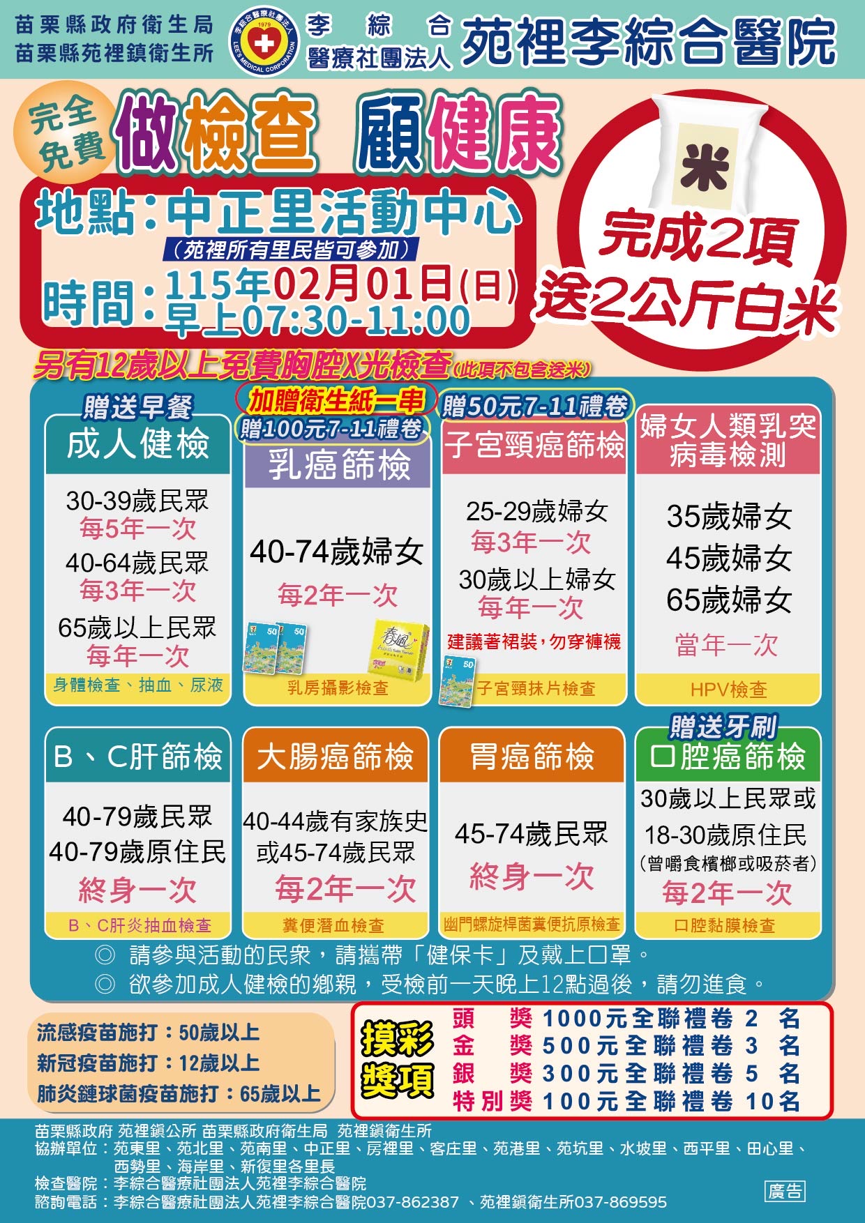 為提升縣民健康照護品質,提供更便利、可近性的預防保健篩檢服務,苗栗縣政府衛生局結合苑裡鎮衛生所、苑裡鎮公所及苑裡李綜合醫院,將於115年02月01日(星期日)上午7時30分至11時00分,假中正里活動中心辦理「做檢查 顧健康」健康篩檢活動,整合多項免費健康檢查服務,讓民眾在熟悉的社區環境中即可一次完成多項檢查,降低就醫門檻,提升參與意願。