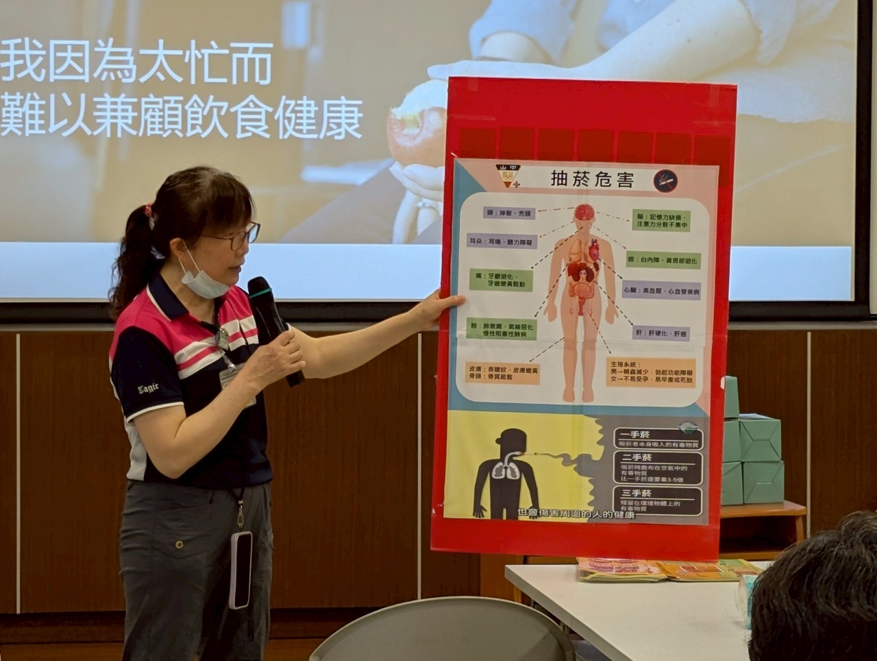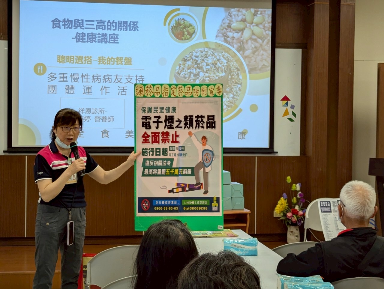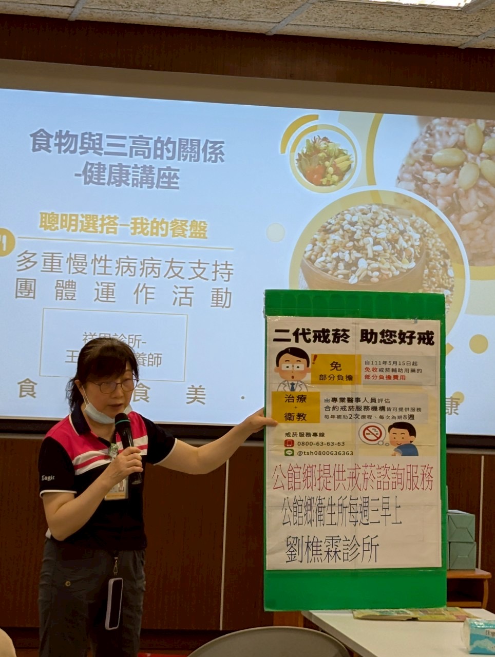 「社區菸害防制宣導」公館鄉衛生所訂於114年04月24日(星期四)上午8:10~8:40於【公館鄉衛生所四樓會議室】,結合【慢性病支持團體活動】,辦理『禁菸場所』、『菸品的危害」‵『全面禁止電子煙之類菸品』及『0800-636363戒菸諮詢專線及醫療單位提供戒菸治療及衛教諮詢服務』宣導,敬請長官蒞臨指導
