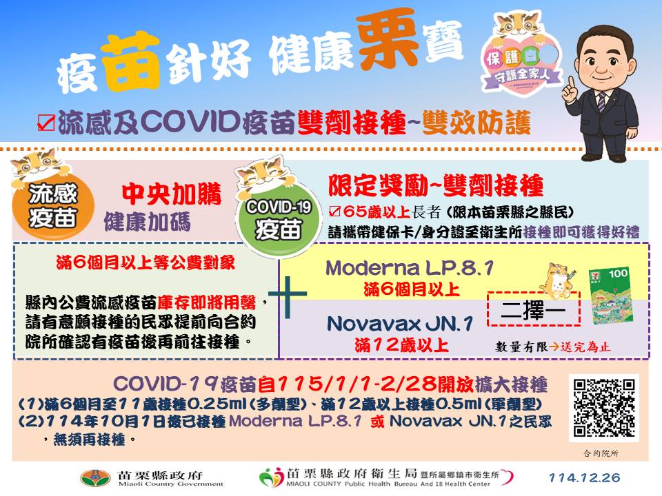 衛生局鼓勵長者接種流感及COVID-19雙疫苗,特別加碼贈送100元衛教品禮券,呼籲縣內今年尚未接種之65歲以上長者,儘速前往18鄉鎮市衛生所接種。相關接種資訊可至疾病管制署全球資訊網或苗栗縣政府衛生局官網查詢,亦可洽詢所在地衛生所。