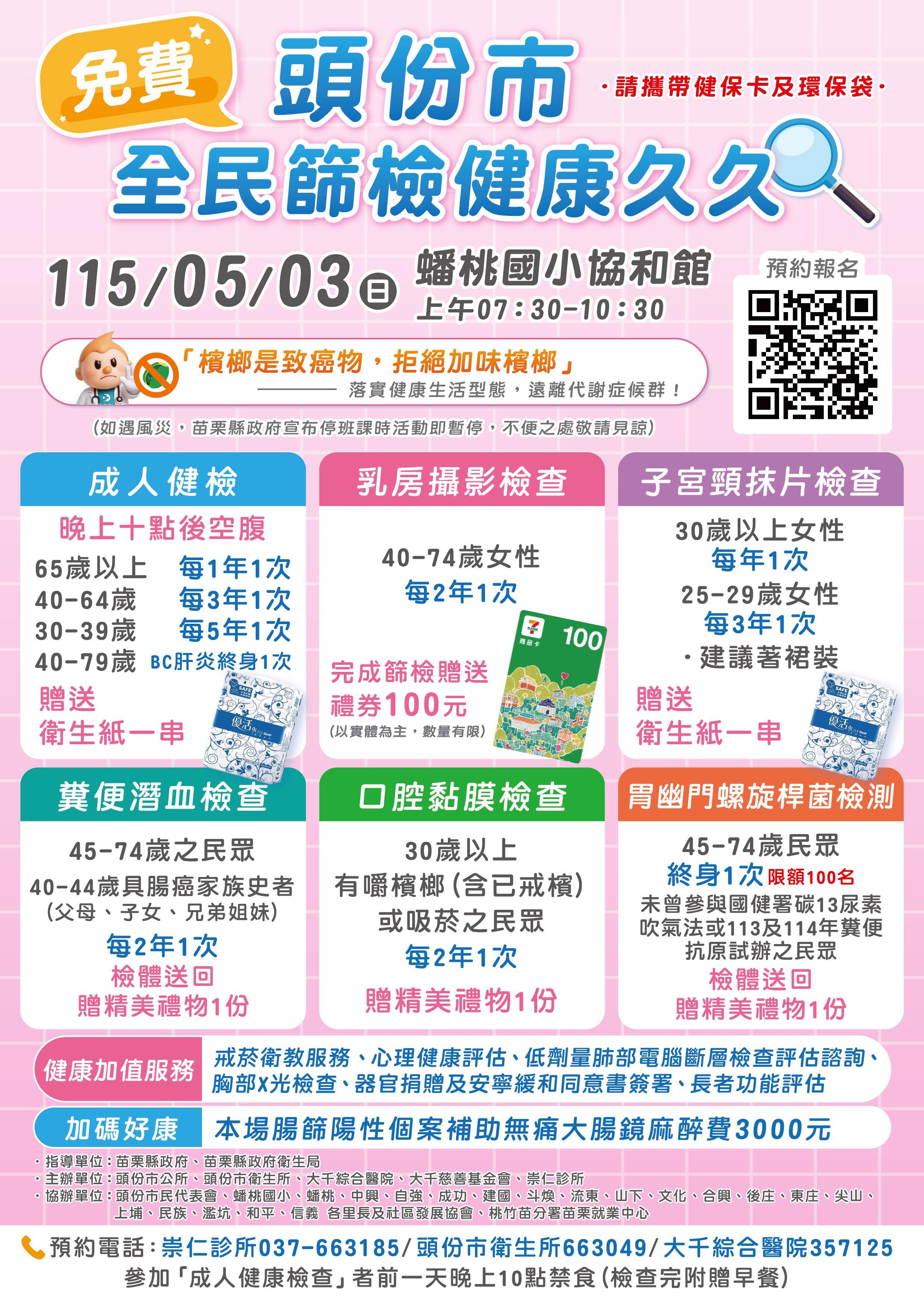 為提升市民參與意願,現場亦提供多項健康好禮,凡完成指定篩檢項目即可獲得衛生紙或精美贈品,完成乳房攝影檢查者另贈100元禮券。此外,為提升大腸癌篩檢異常之追蹤,凡經篩檢為大腸癌陽性個案者,提供無痛大腸鏡麻醉費補助3,000元,以減輕後續檢查負擔,提升就醫意願。