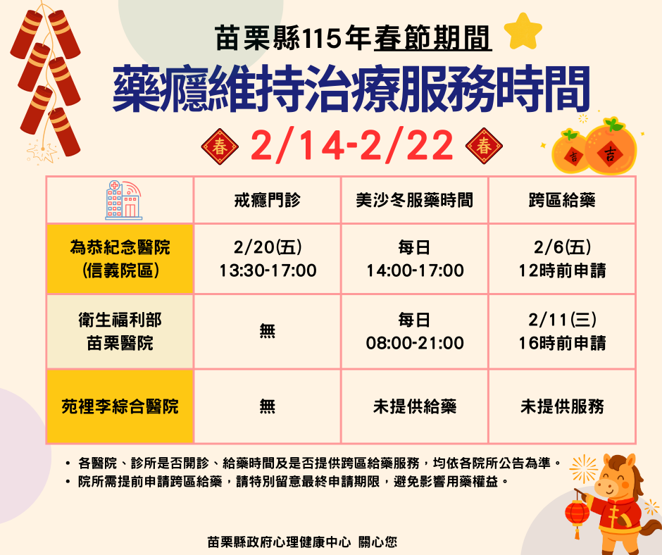115年春節期間 藥癮維持治療服務時間公告